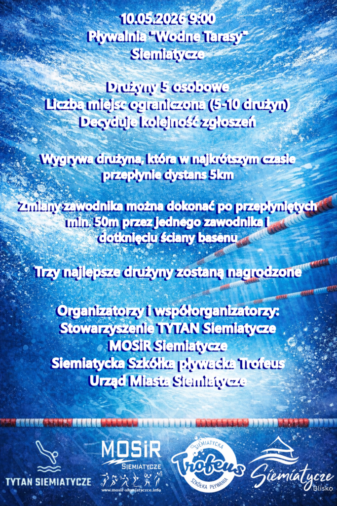 Organizatorzy: Stowarzyszenie TYTAN Siemiatycze, MOSiR Siemiatycze, Siemiatycka Szkółka Pływacka Trofeus i Urząd Miasta Siemiatycze.